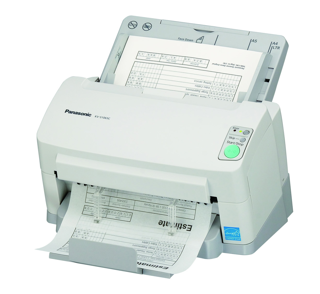 To reduce costly power consumption, the Panasonic KV-S1065C scanner has been engineered for minimal power consumption. The KV-S1065C features LED lighting as the scanning light source, a CIS (Contact Image Sensor) for scanning, a sleep mode that suppresses energy consumption to 1W while the units is idle and an auto power off feature. These features help ensure this scanner consumes the least amount of energy possible.